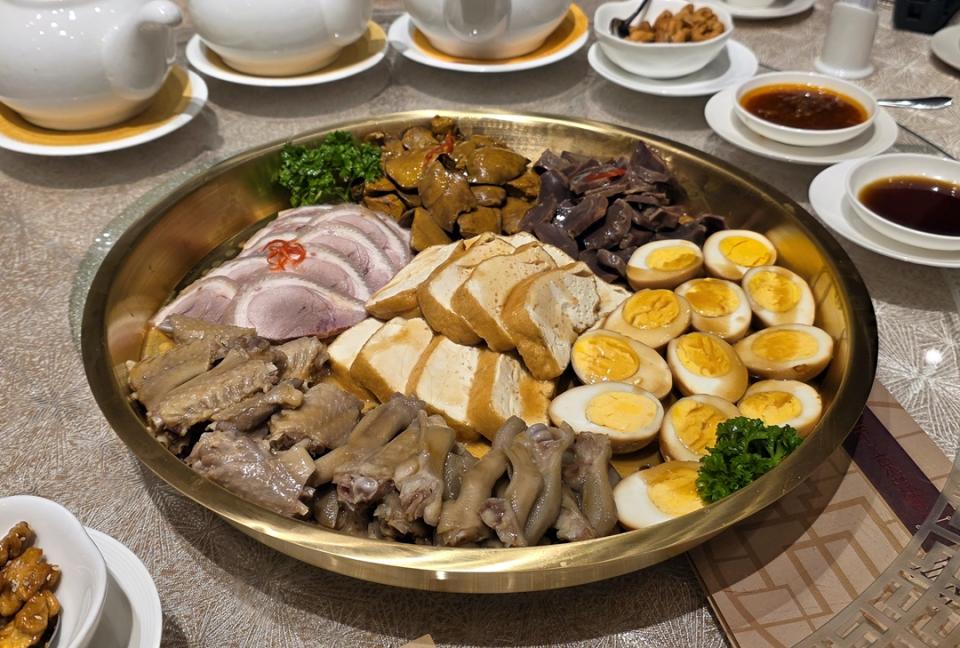 滷水拼盆有鵝掌、鵝翼、豆腐、燻蹄、滷水蛋、珍肝等經典食材,滷得入味,上色又美,各食材都能以最佳口感呈現出來,鵝翼輕咬已可骨肉分離,不用大費力氣才吃到、豆腐仍然滑嫩、珍肝厚實飽滿,令人想一吃再吃。