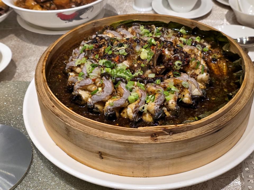 蟠龍鱔好像已經少見了,將每件鱔身以 2 釐米斜切至骨,置於新鮮荷葉的蒸籠中,佐以香濃的豆豉。鱔段入口爽彈,飽滿多汁。