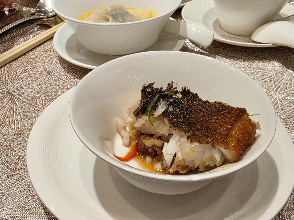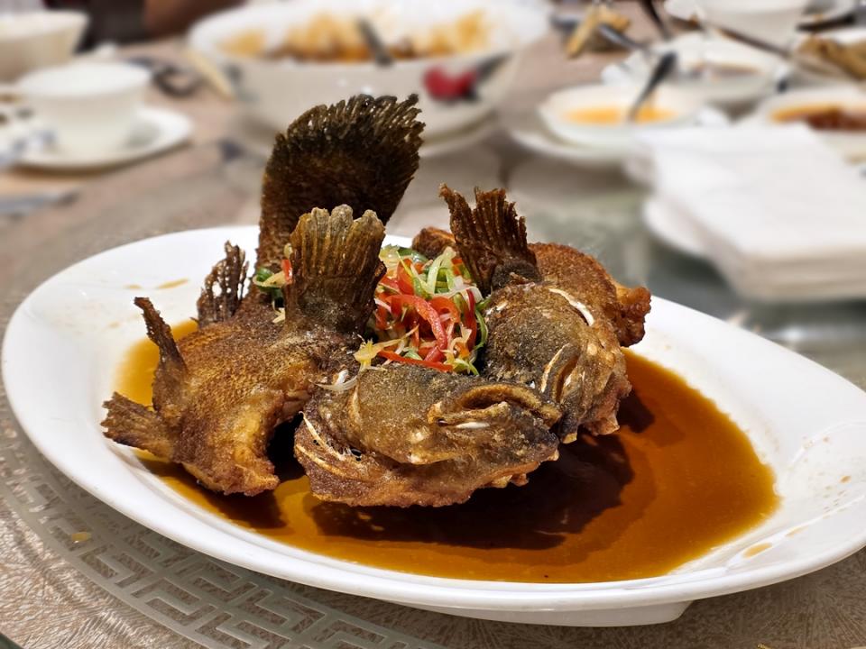 以熱油反覆淋燙魚身,上碟前再淋上香蔥薑絲,香氣十足,皮脆肉嫩,非常香口。