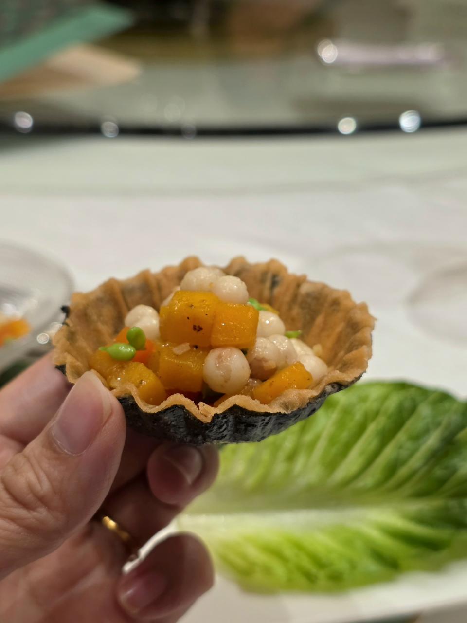南瓜彩椒雞頭米配紫菜脆杯及生菜片,素菜都可以好美味,三種吃法,各有風味,放紫菜脆杯內吃,香脆可口;以羅馬生菜包著吃,清爽鮮甜。