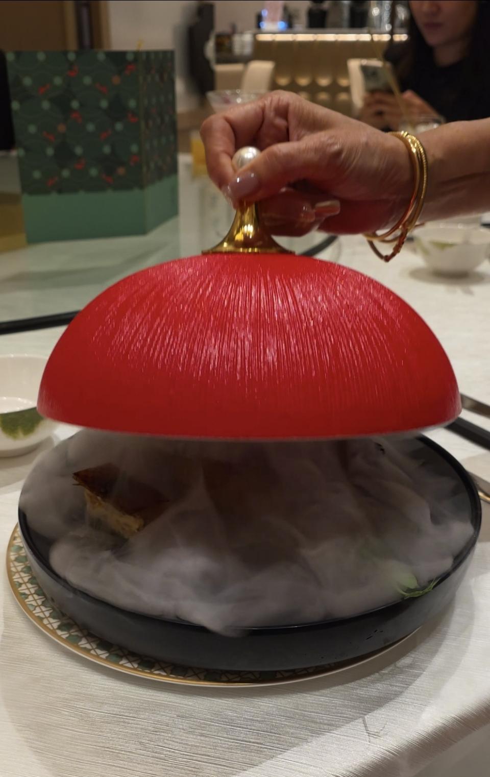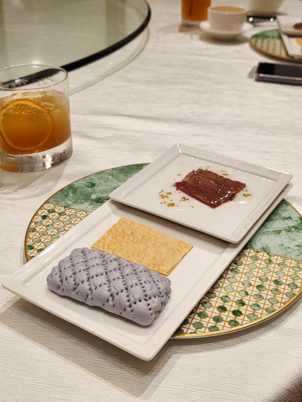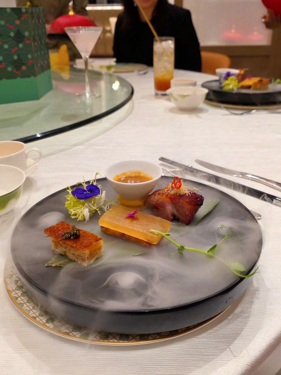 先來三款精緻前菜,分別是麻辣花膠方雞、意大利黑醋蜜瓜香煎本地松阪豬、桂花蜜味豚肉叉燒;仙氣登場,上菜也充滿儀式感。
