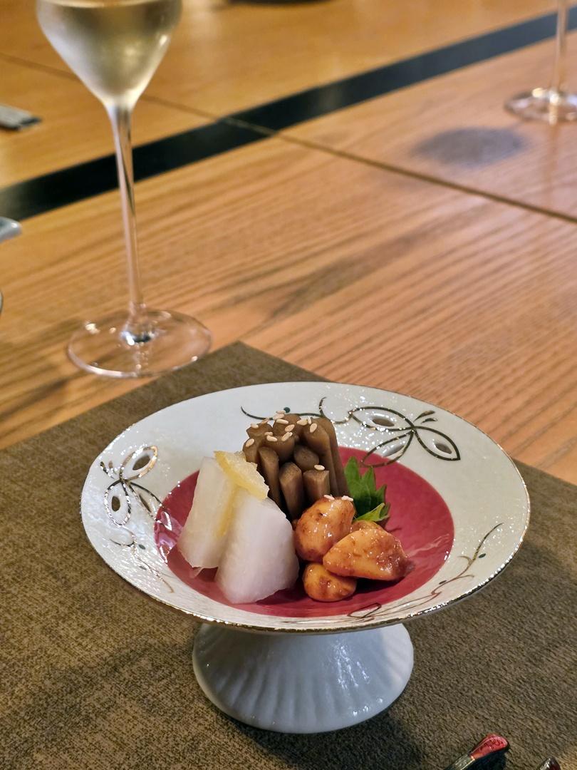 分別是蒜子漬及兩款自家醃製之漬物–柚子蘿蔔、醬油漬牛蒡。