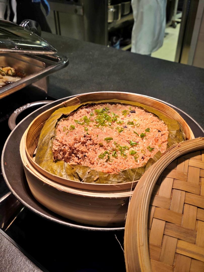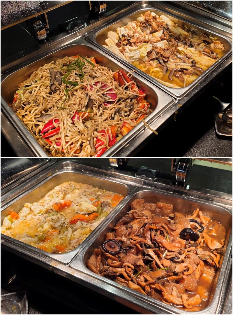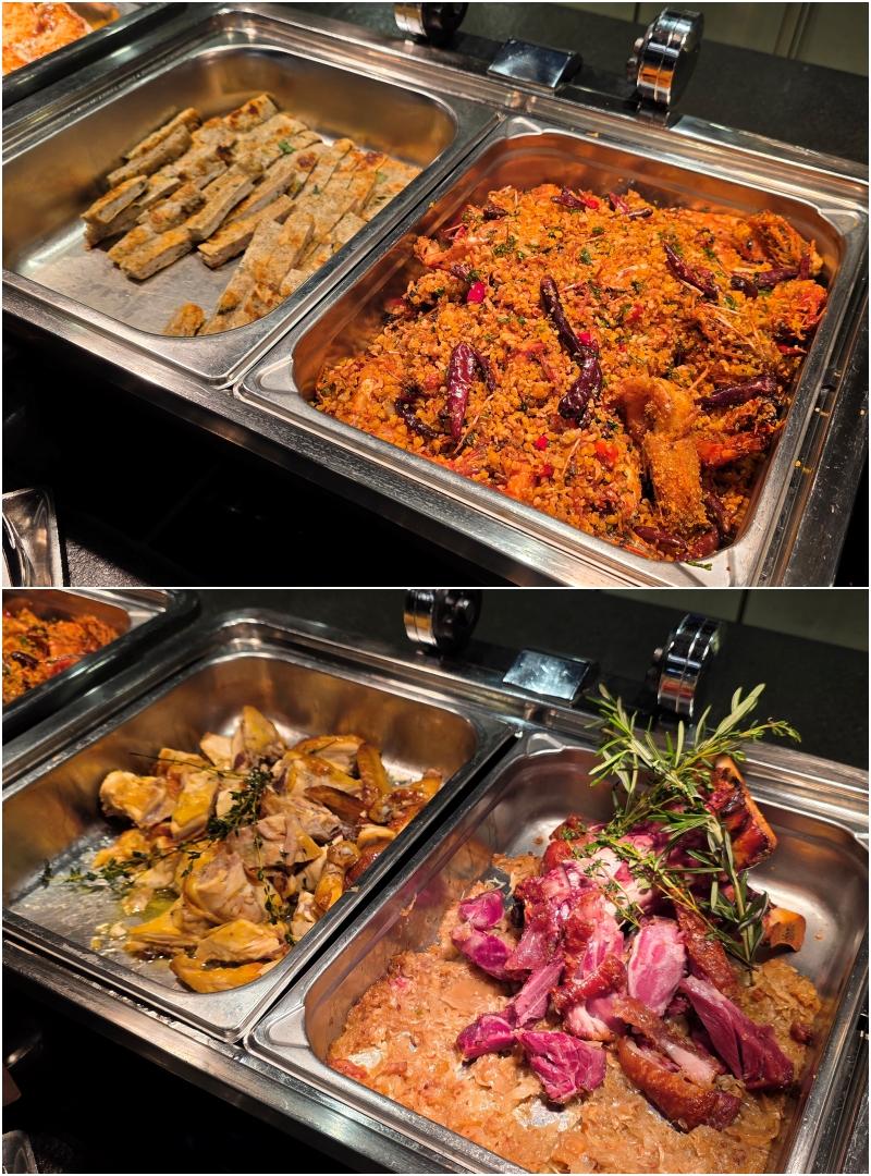 熱葷方面有避風塘炒蝦、蘿蔔炆牛腩、煎鯪魚餅、蒸比目魚、 鮮菌扒魚肚、脆香豬手、臘味荷葉飯、龍蝦鉗伊麵、釀蟹蓋、焗蠔、滷水拼盆,幾乎是宴客不可缺少的經典懷舊菜,算是我吃熱葷較多的一晚。