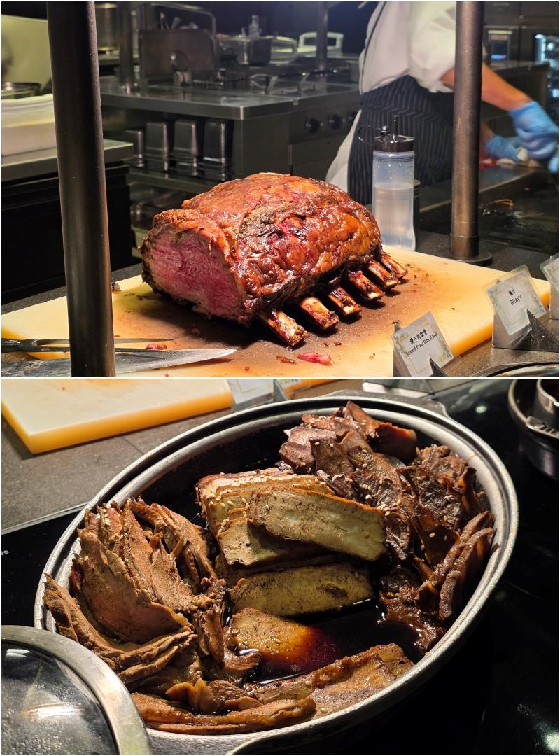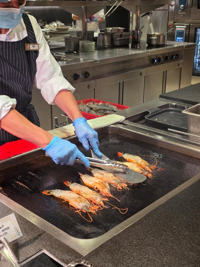 切肉區是燒原條有骨西冷,肉味香濃,口感柔嫩;旁邊是即煎虎蝦,爽彈鮮美。