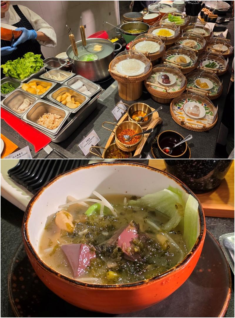 湯麵檔有即煮酸菜湯,配上各款配料如豬紅、豆卜、魚腐、腩肉等,另可在酸菜湯上自行加上花椒油,惹味又美味。