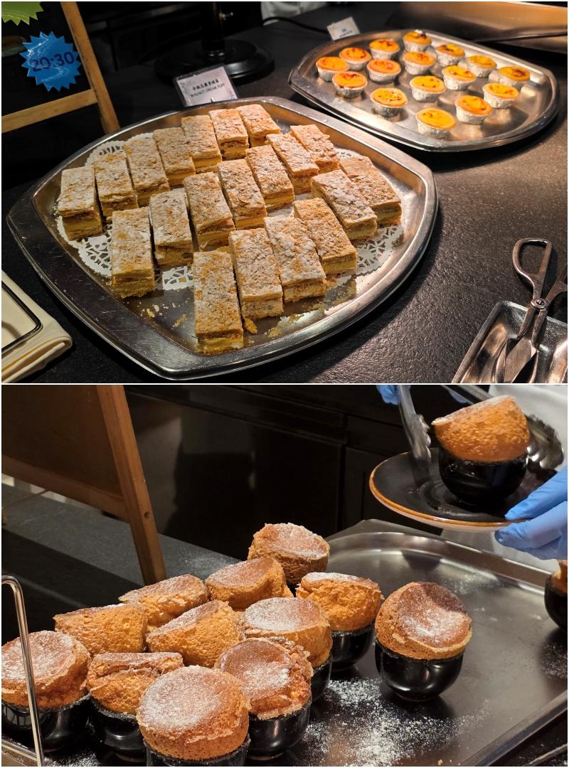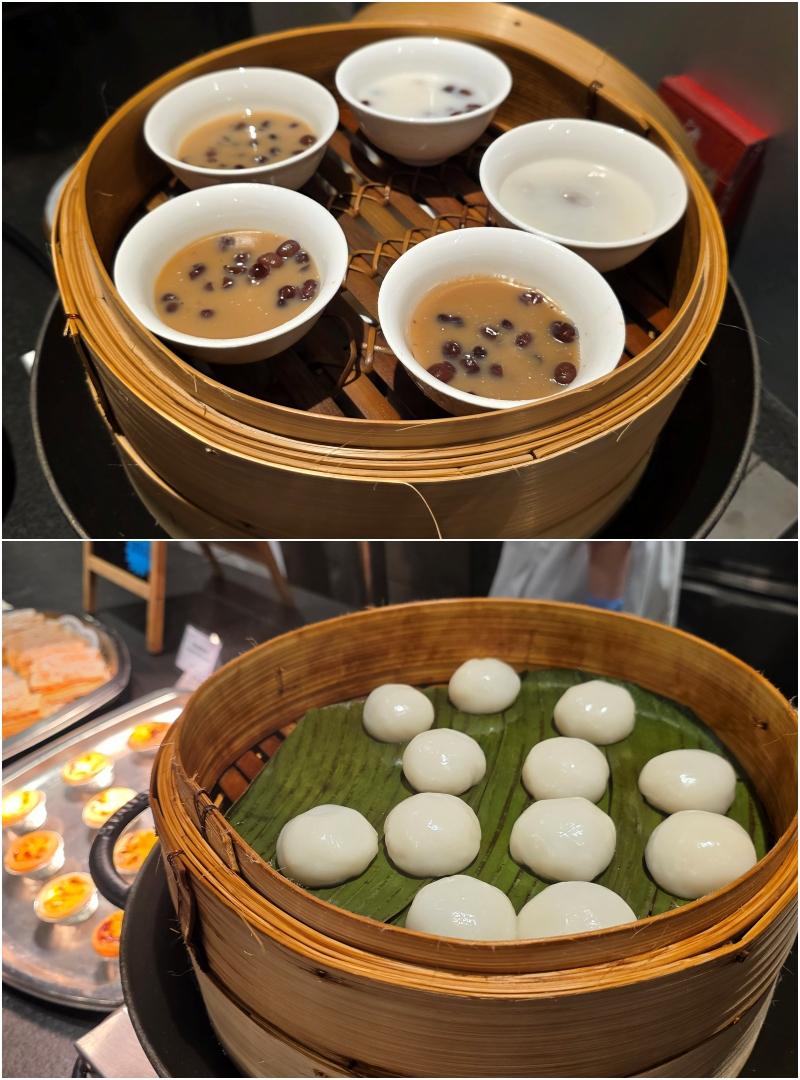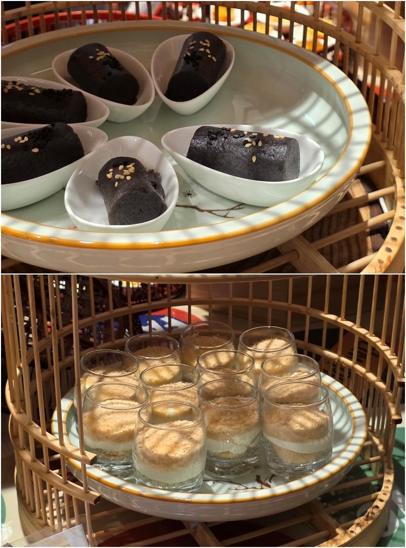 甜品蛋糕中,最經典的莫過於黑森林蛋糕、懷舊黃梅果占蛋糕、 芝麻卷 (又名菲林)、砵仔糕、紅豆茶果、遮仔啫喱糖,在茶樓中好受歡迎的啊,充滿回憶。另有焗梳乎里、 合桃忌廉拿破崙、懷舊乾果蛋糕,豆腐花等。