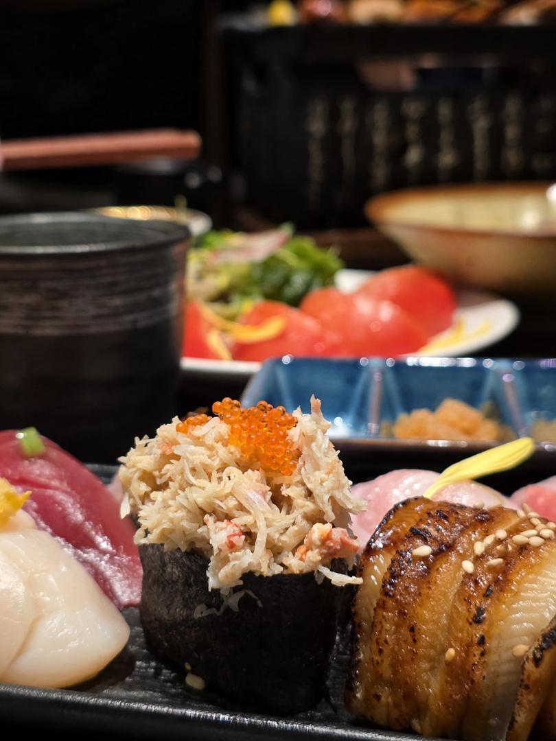 鹿兒島間八、北海道帆立貝壽司、赤海老、吞拿魚(赤身)、吞拿魚中腩、海鰻、松葉蟹肉、金目鯛、時令海鮮、火炙紅葉醬比目魚裙邊(一口丼)。赤海老加上蝦頭膏作點綴,味道更上一層樓;帆立貝搭配柚子皮,增添清甜香氣。