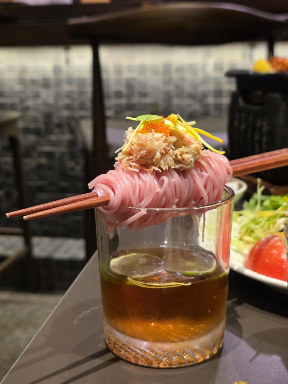 松葉蟹肉梅子素麵HK$136,鮮甜幼嫩的松葉蟹肉,爽滑的梅子素麵,賣相精緻,超好打卡的,把它們一併放到以鰹魚湯及青檸汁製成的冷湯中,微酸甜而清爽,愛上了﹗