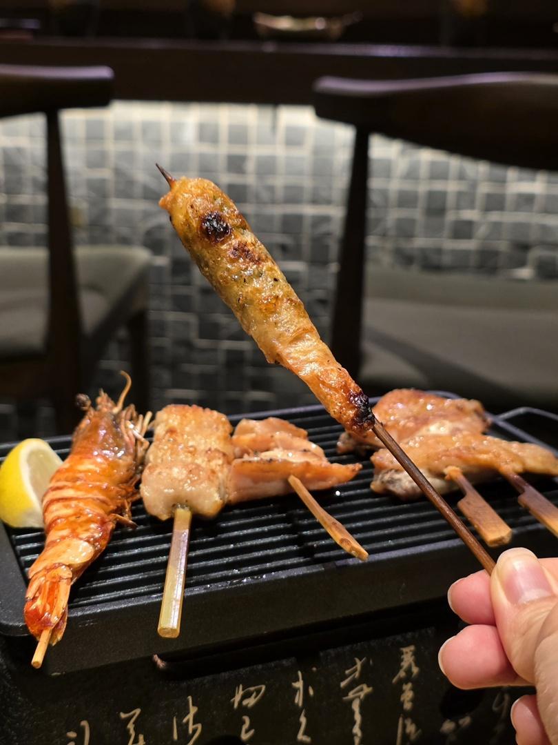 要來點熱食啦,極上‧串燒盛HK$188,雞脆骨串、雞翼、雞皮紫蘇蝦卷、雞大腿肉串、車海老(虎蝦)。最愛雞皮紫蘇蝦卷,口感豐富,想一吃再吃;雞翼香口、大腿肉爽彈又肉嫩。
