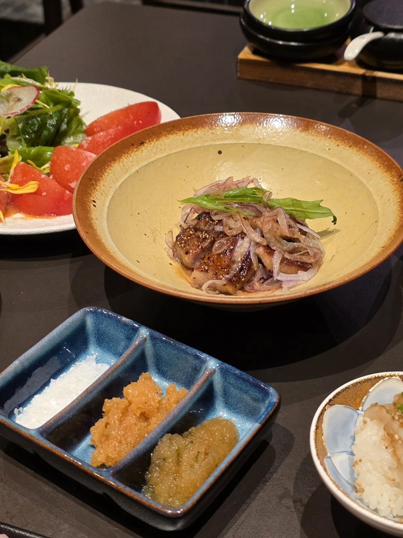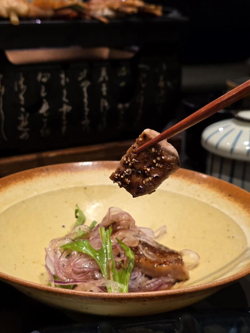 燒牛舌芯粒三味HK$138,搭配洋蔥絲及京蔥絲,牛舌芯外焦內軟而爽彈,另可分別蘸上淡雪鹽、和風紫蘇大根醬、檸檬鹽燒醬,更有風味。