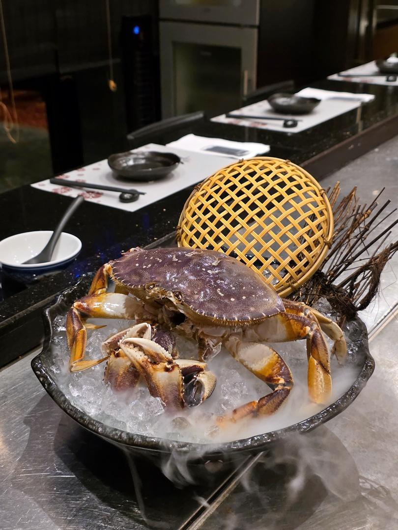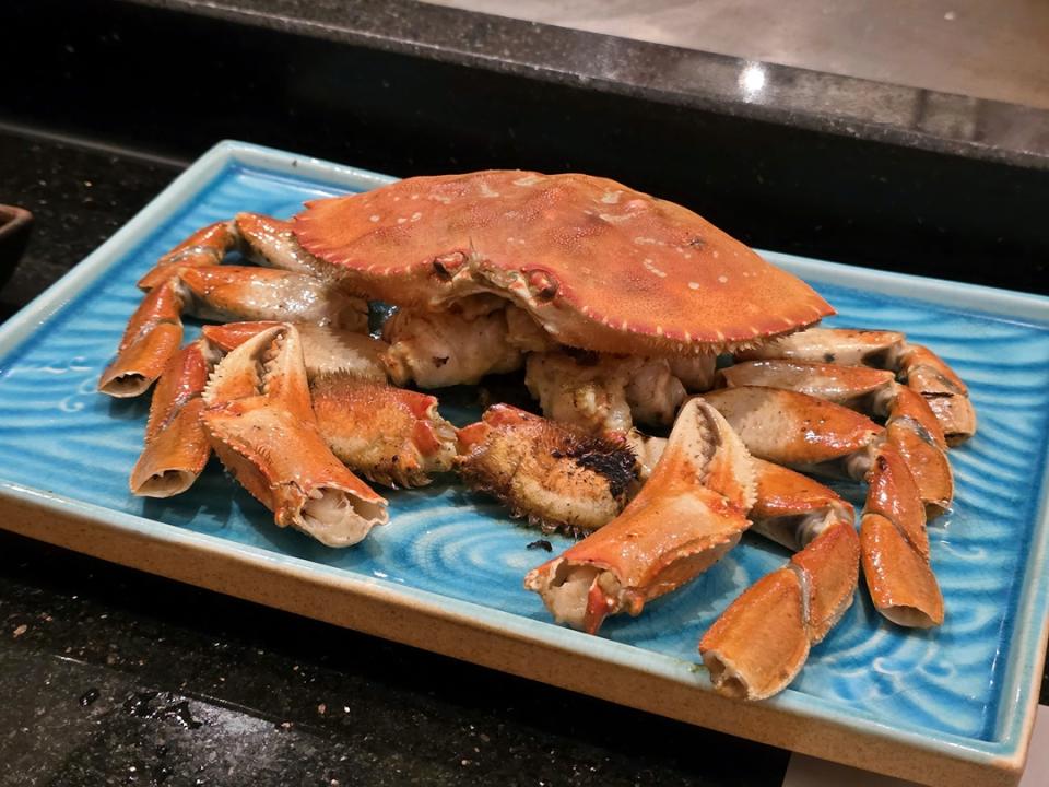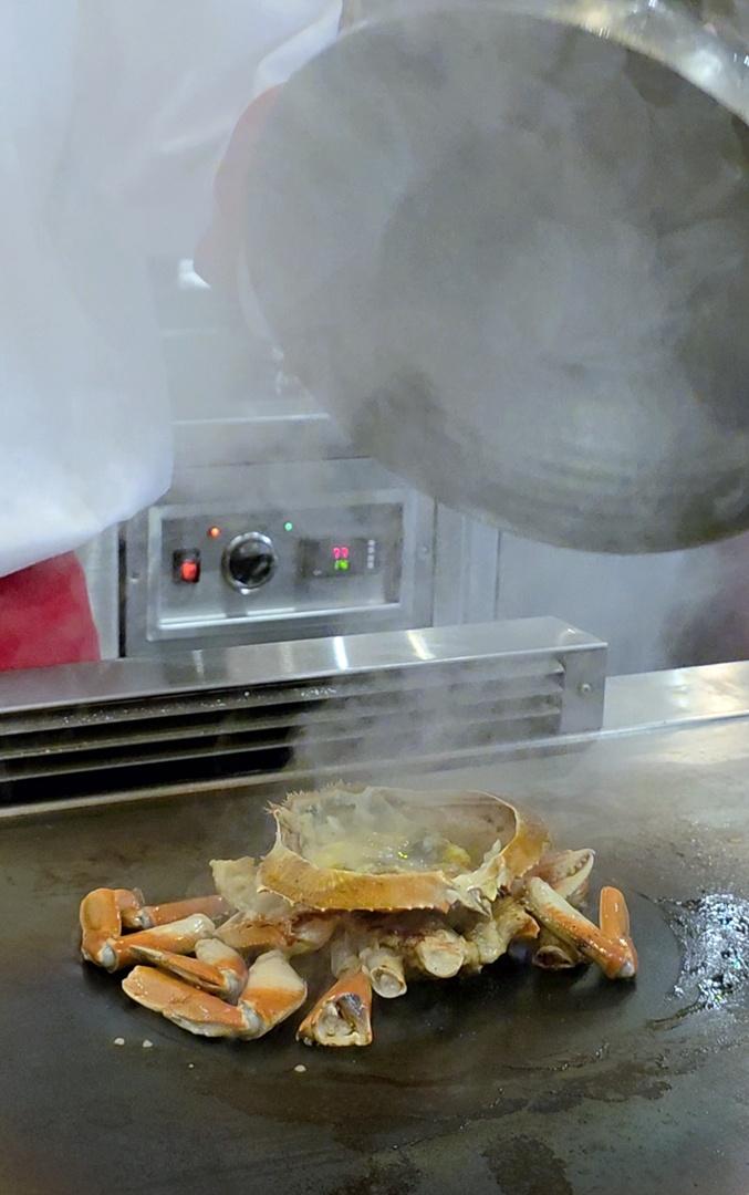 主角出場啦,鐵板燒時令原隻蟹,這隻是加拿大珍寶蟹,烹調時間恰恰好,肉嫩鮮甜多汁,師傅還特意剪開蟹腳及蟹鉗等位置,方便我們可輕易取出蟹肉享用呢,加分。