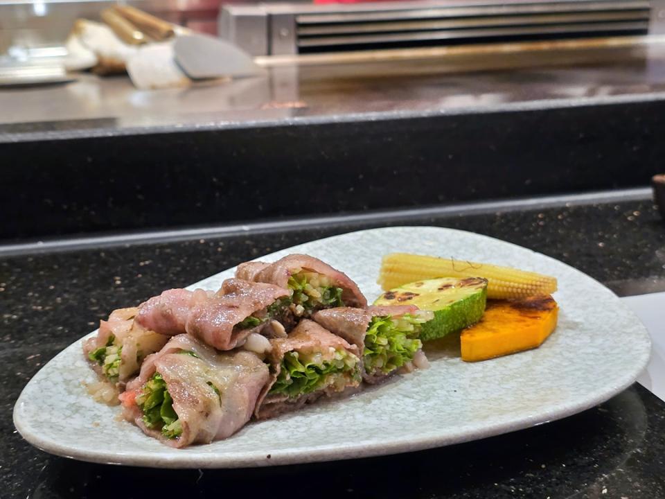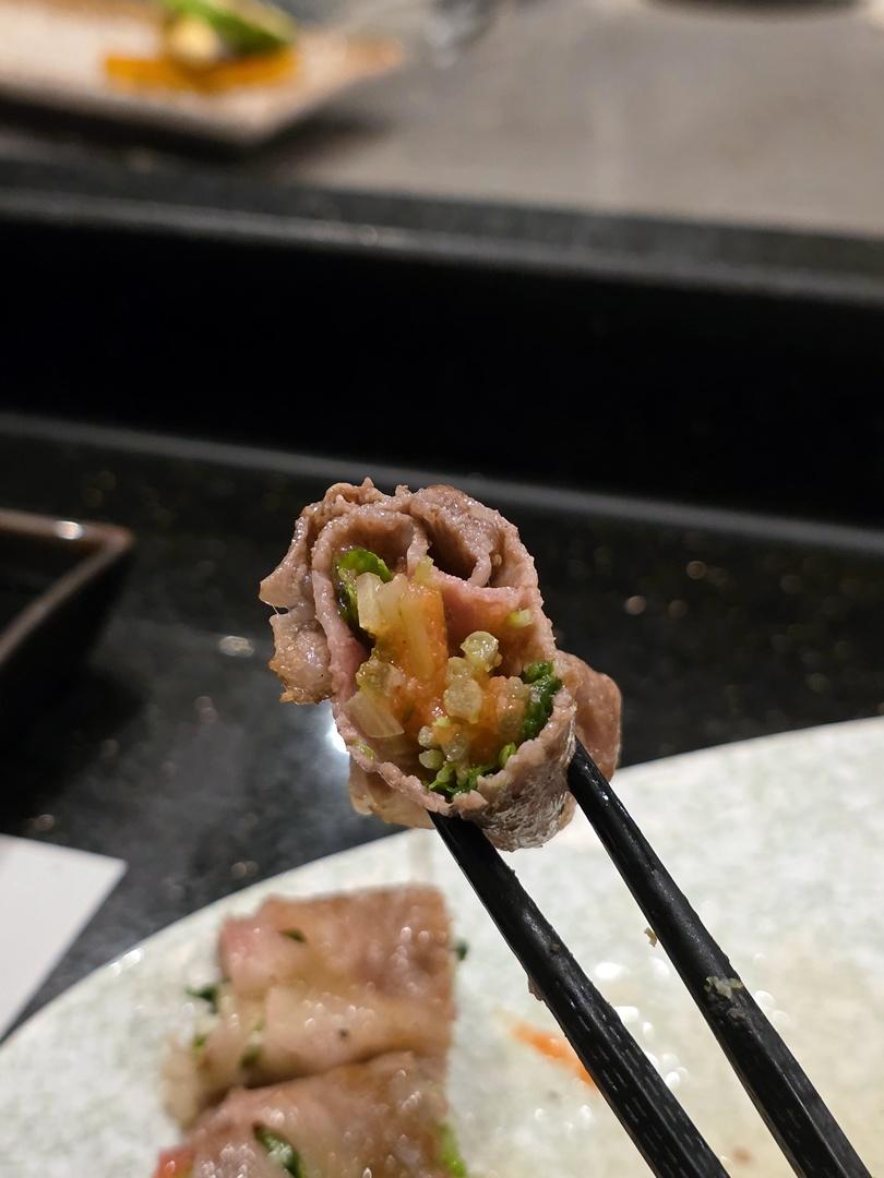 北海道A5和牛薄燒(4片),和牛薄燒輕煎後卷著鹹鮮明太子及爽嫩水菜,感覺更清新減膩。