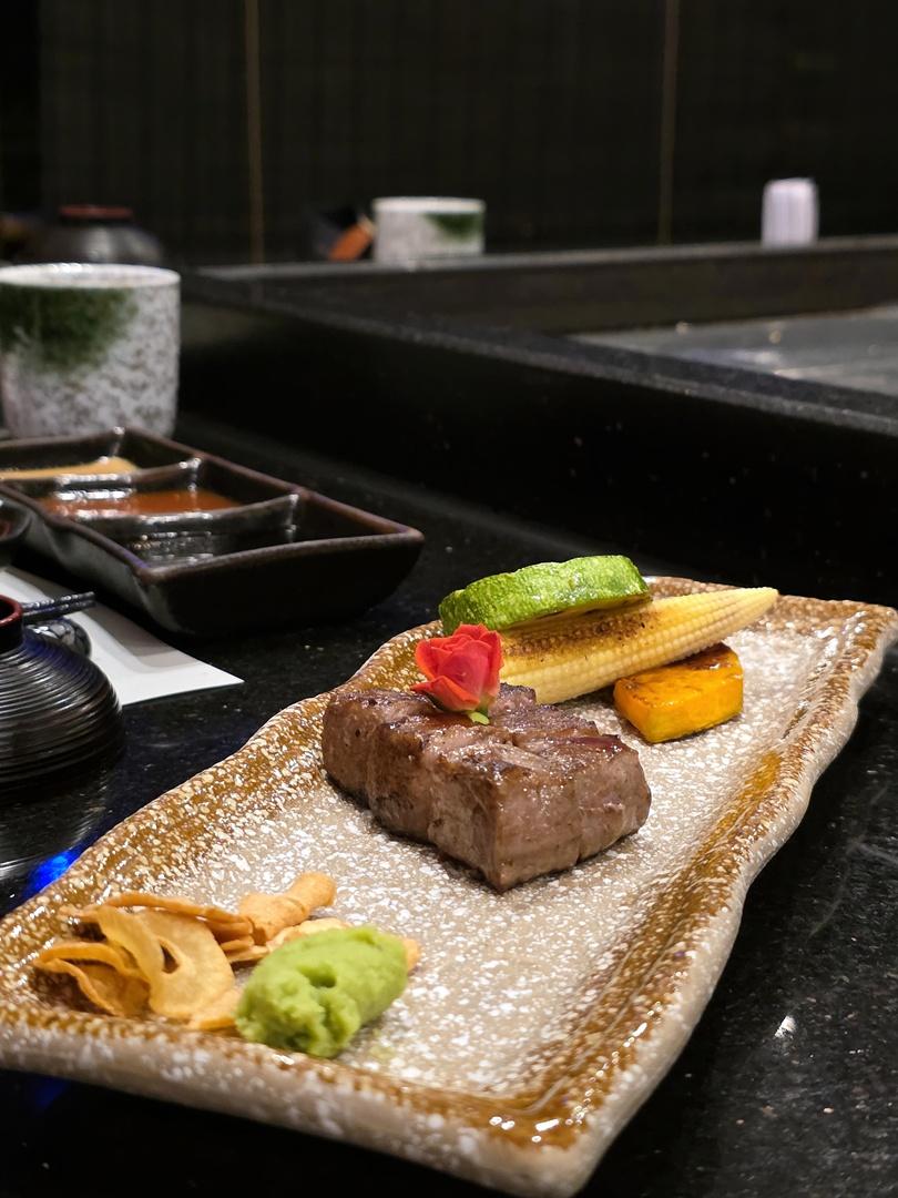 北海道A5和牛厚燒(120g),爆油和牛,輕煎後用猛火燒一燒鎖住油花,香口同時軟嫩鮮甜,夾著芥末及脆炸蒜片更豐富。