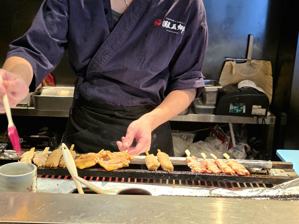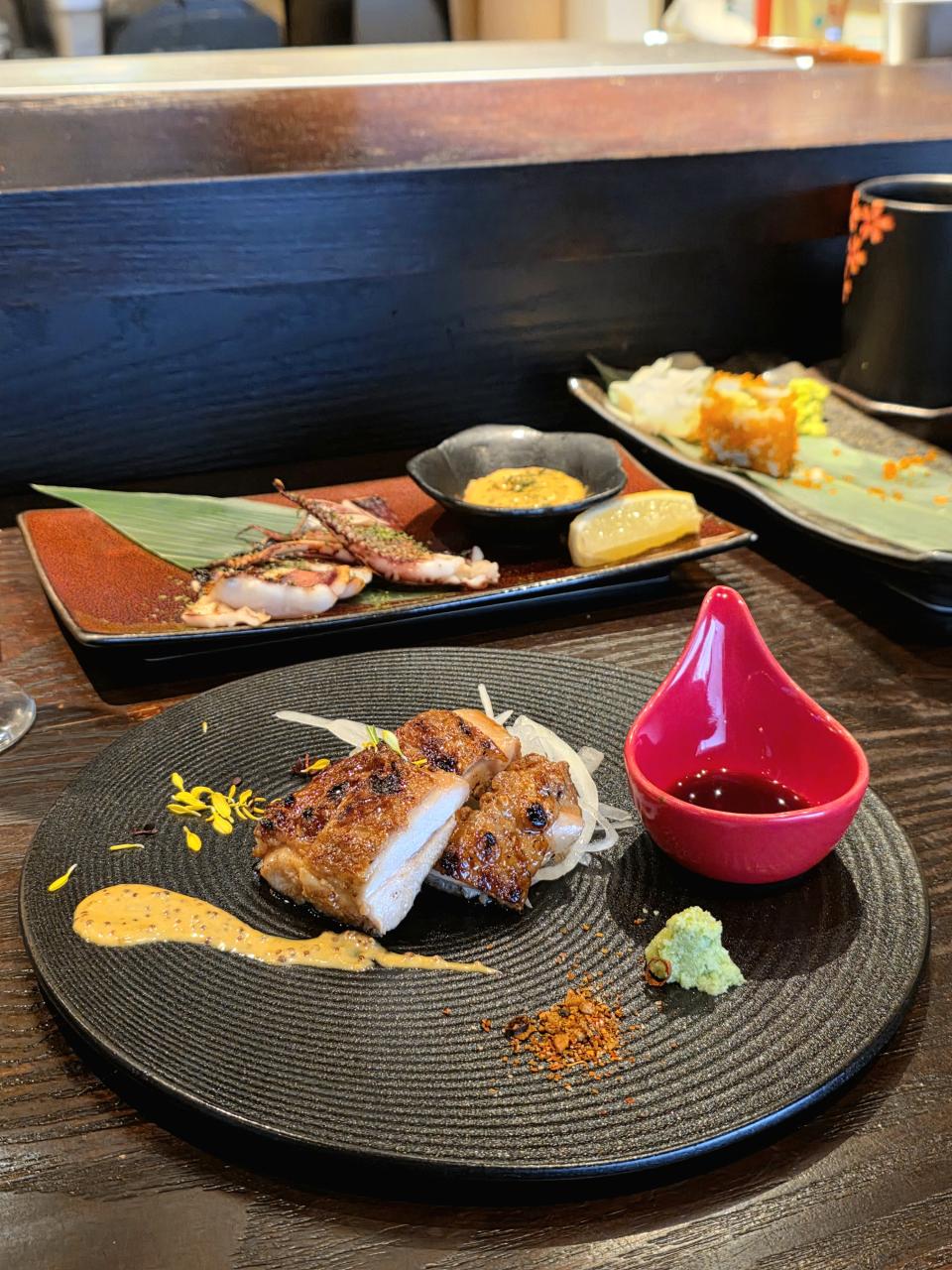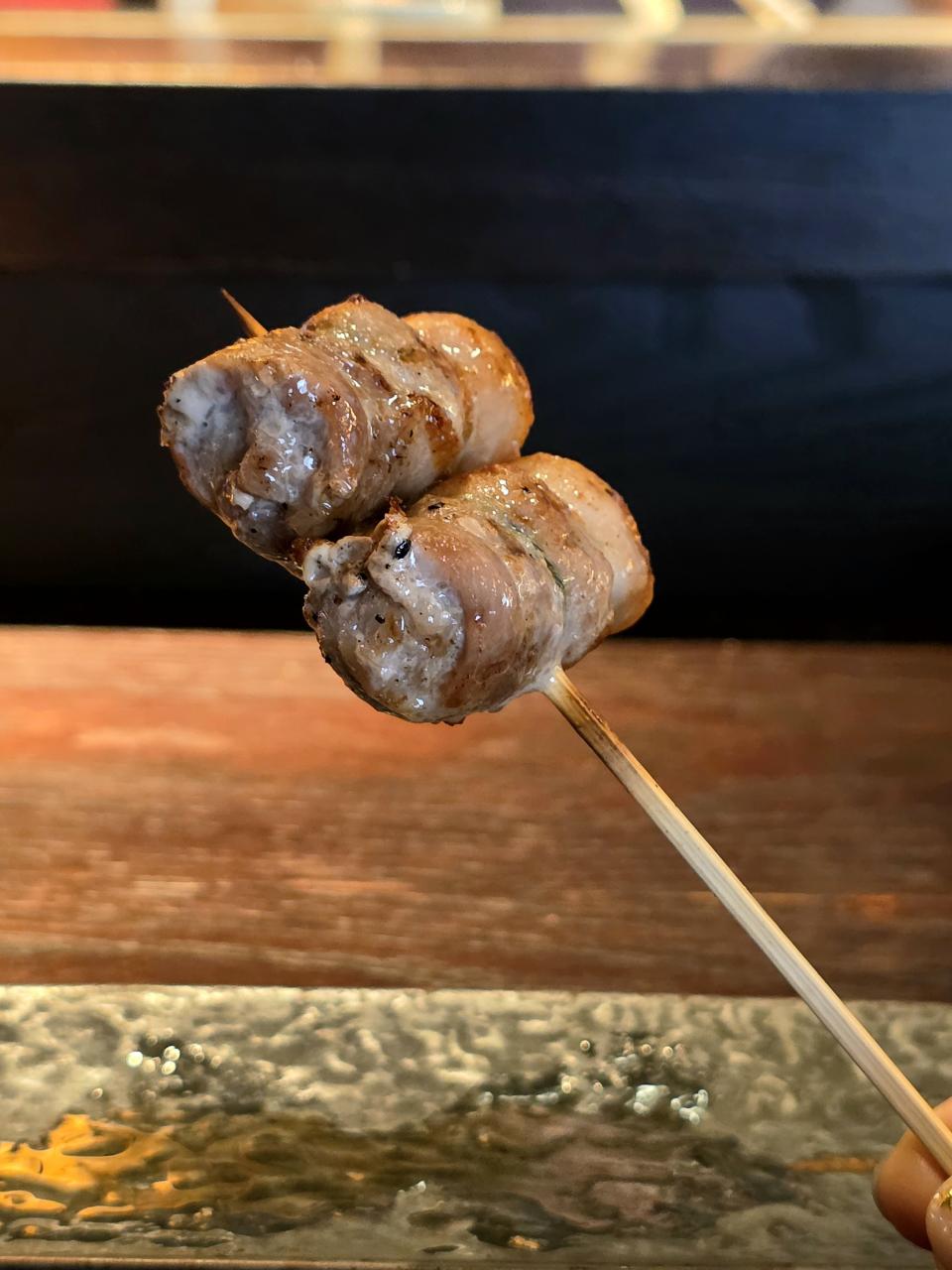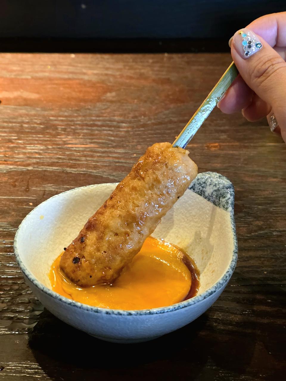 要從多款串燒中選2款,實在令人難抉擇,嚴選德島阿波尾雞,雞皮、雞中翼、雞膝軟骨等,最終我們選了明太子紫蘇豚肉卷及自家製月見日本免治雞肉棒,前者充滿油脂香,燒得香口;而免治雞肉棒與醬油蛋黃拌勻後,入口軟滑且濃郁香醇。