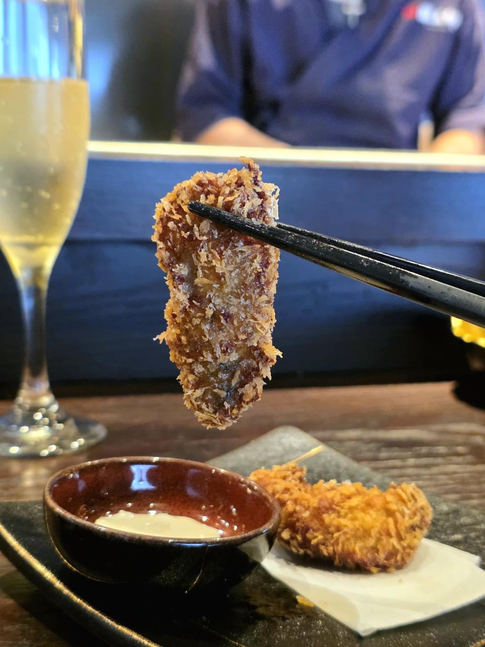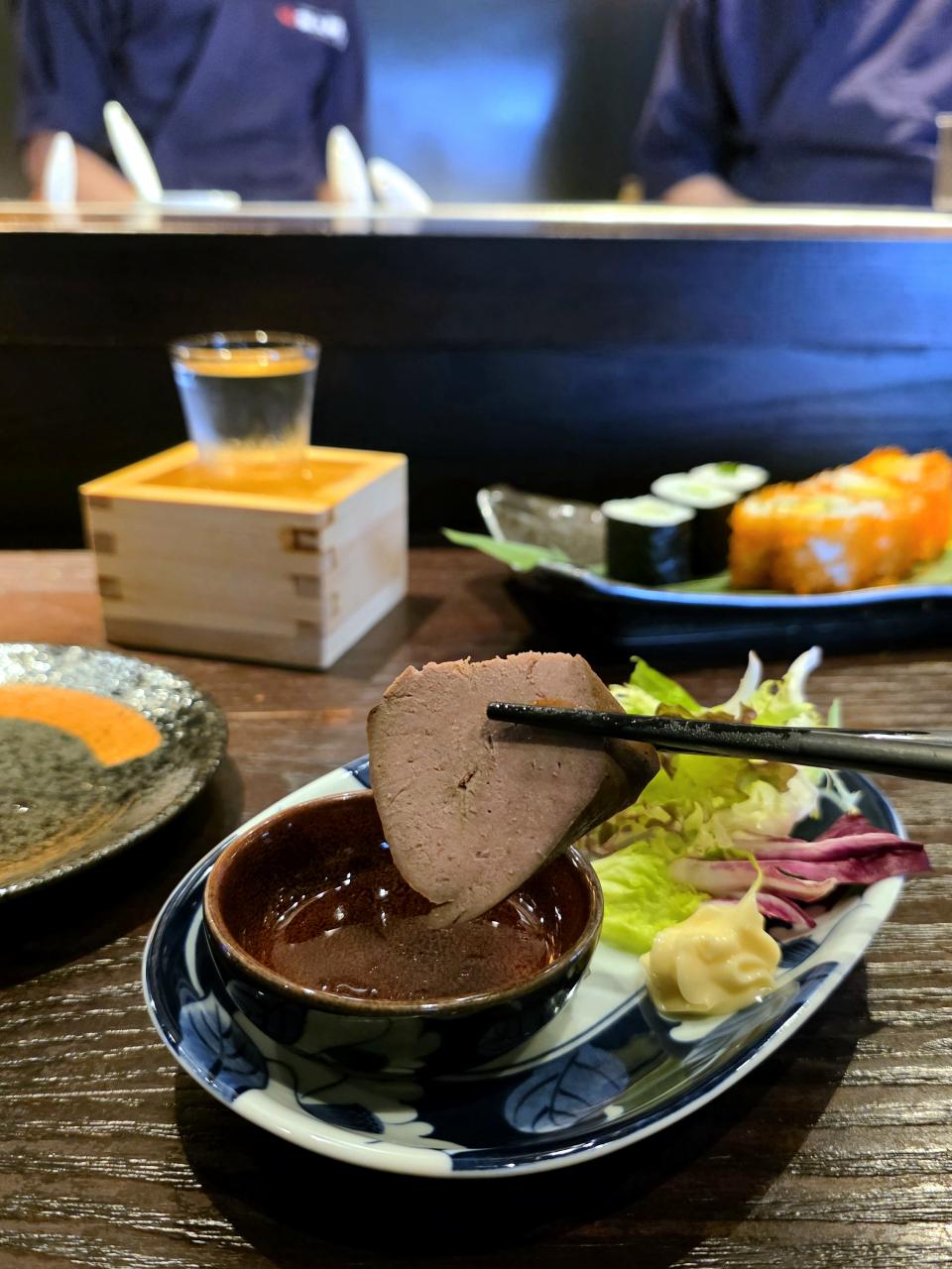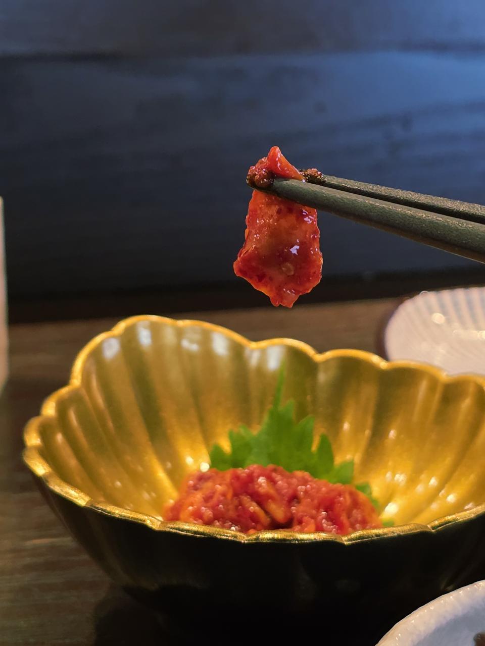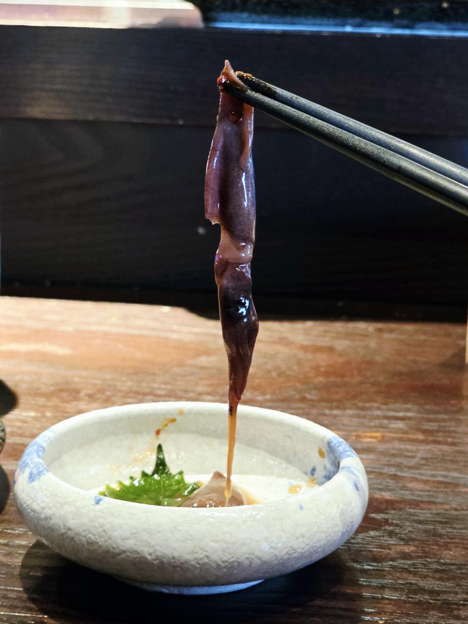 要從多款串燒中選2款,實在令人難抉擇,嚴選德島阿波尾雞,雞皮、雞中翼、雞膝軟骨等,最終我們選了明太子紫蘇豚肉卷及自家製月見日本免治雞肉棒,前者充滿油脂香,燒得香口;而免治雞肉棒與醬油蛋黃拌勻後,入口軟滑且濃郁香醇。